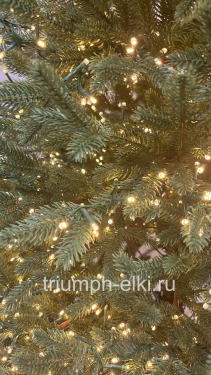 Встроенные LED-лампочки теплого света равномерно распределены по всей кроне - их действительно очень много, и именно это создаёт ощущение живого свечения, будто ель освещена мягким зимним солнцем. Свет не режет глаза, а уютно мерцает, наполняя пространство теплом и атмосферой праздника.